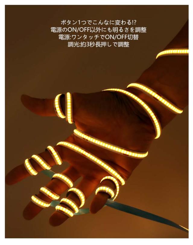 | 貼るだけで雰囲気が作れる テープライト USB給電 長さ2m 8色 ポイント1 さらに魅せる間接照明 COB(ChipOn Board)でさらにはっきり! 180°満遍なく広がる明るさ。 ポイント2 どこでもる使える 「柔らかさ」 曲げても壊れない圧倒的な柔軟性! 自宅や店舗、オフィスのDIYに大活躍! 小さな光を1つの均一でムラのない光 長持ちするので、お家やお店、外の照明に使われます。 ポイント3 ボタン1つでこんなに変わる!? 電源のON/OFF以外にも明るさを調整 電源:ワンタッチでON/OFF切替 調光:約3秒長押しで調整 ポイント4 満足した長さに カット お好みの長さに調整できます 目印もあるのでらくらくカット♪ ポイント5 圧倒的にUSBが人気のワケとは!? 電源がどこでも手に入るのでイベントや野外でも簡単に使えます | |