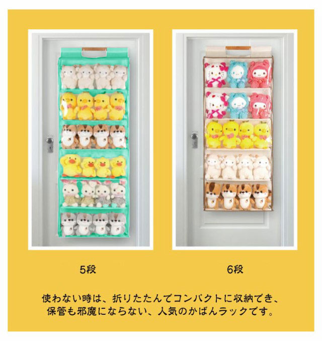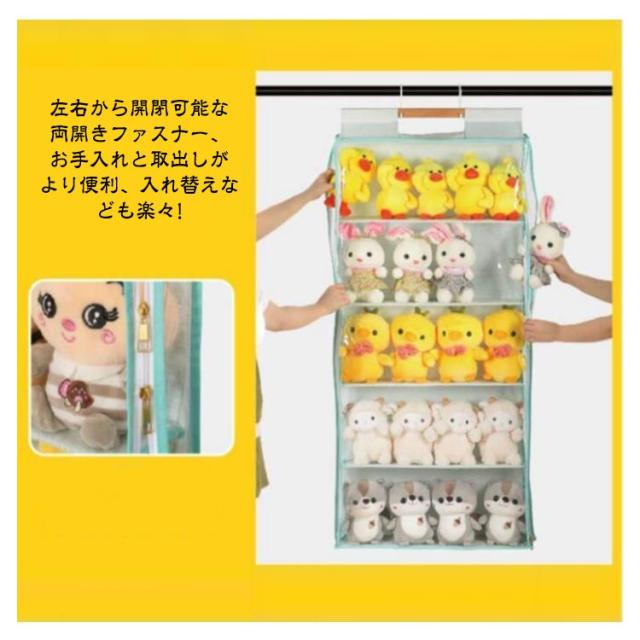 | 【ぬいぐるみウォールポケット】【5段/6段収納ケース】 スタイリッシュデザインのディスプレイラックです。 透明度の高いビニールになっていて、中に入れたものをディスプレイしながら壁面に収納できるアイテム。 左右から開閉可能な両開きファスナー、お手入れと取出しがより便利、入れ替えなども楽々! 密閉設計で湿気やホコリを遮断し、大切なコレクションを守ります。 【使用場所自由自在】3種類のフックが付いているので、マルチな掛け方があり、ドア後・壁面・棚・クローゼット側などさまざまな場所で活躍する収納です。 使わない時は、折りたたんでコンパクトに収納でき、保管も邪魔にならない、人気のかばんラックです。 | |
