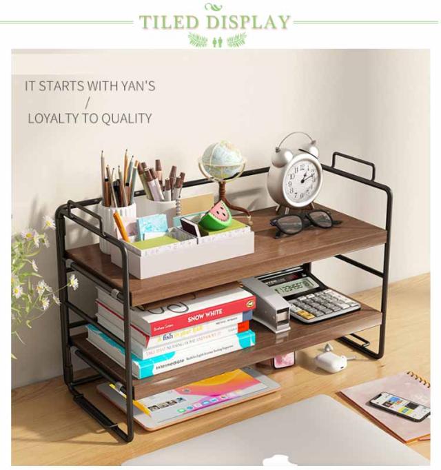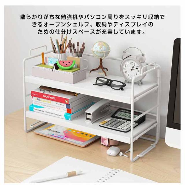 | 板の高さが調節できる卓上ラック。 可動式棚板のオープンシェルフは、高いものも簡単に収納することができます。 散らかりがちな勉強机やパソコン周りをスッキリ収納できるオープンシェルフ、収納やディスプレイのための仕分けスペースが充実しています。 フレームは連結することもできるから、積み重ねても安定感のデスク上収納ラック。 縦に重ねて連結すると、スペースはそのまま、収納力は倍増! 本や文房具、化粧品などのコレクションを整理したり、キッチンに調味料の収納としたり、いろんな場所に使用できて様々のニーズに満足できる上品ミニ卓上収納ラック。 | |