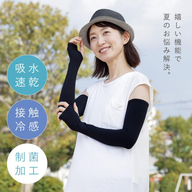 接触冷感がひんやり気持ちよい。吸水速乾&制菌加工機能付きの、暑い季節に大活躍のアームカバー。UVカット率約90%なので、紫外線からしっかりガード。自転車や車の運転にもおすすめ。