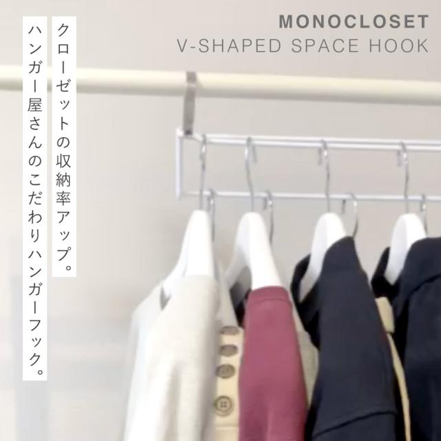 ハンガー屋さんのこだわりハンガー。高品質ハンガー「モノクローゼット」シリーズ。クローゼットの収納率アップ。段違いに掛けられる「V字スペースフック」。