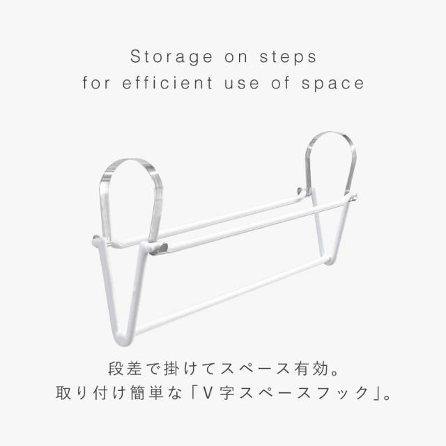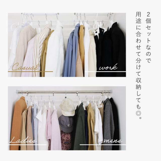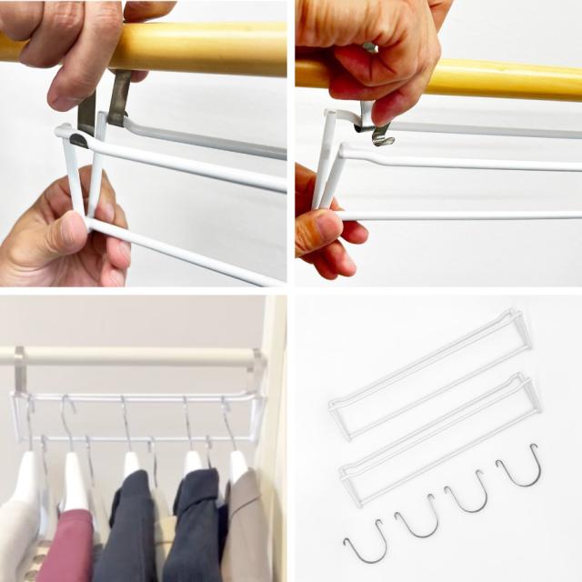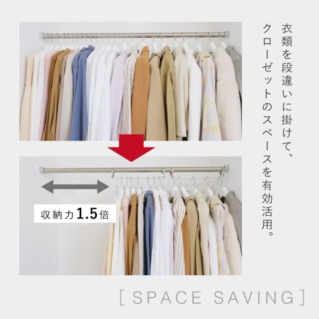 衣類を段違いに掛けて、服がいっぱいのクローゼットをすっきりスマートに。スペースを有効活用でき、収納力を1.5倍にできます。