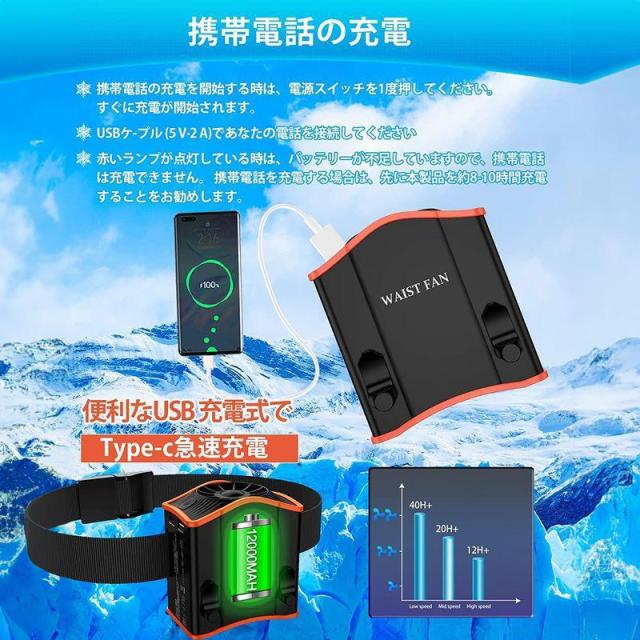 【携帯電話の充電】携帯電話の充電について 1.USBケーブルを使用してください。 2.赤いランプが点灯している時は、バッテリーが不足していますので、携帯電話は充電できません。 本製品を使用すると、自動保護装置が作動しウエストファンへの電力供給が優先されます。