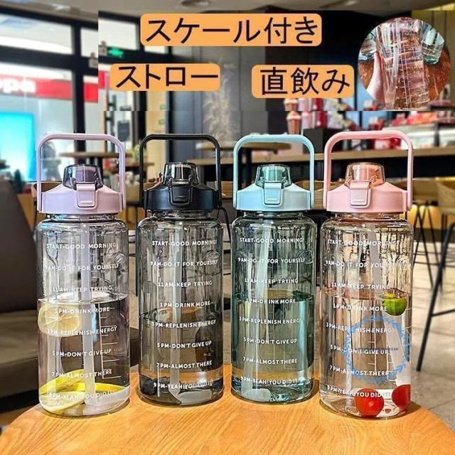水筒 目盛り付き ボトル 2L ウォーターボトル 2リットル タイムマーカー ストロー付き 携帯便利 漏れ防止 高い密封性 子供 透明 目盛り 大容量 軽量 直飲み
