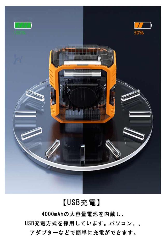 | サイズについての説明 | ・サイズ:9*12*5.5cm ・重さ:約265g ・ファン風量:弱,中,強(3段階) ・消費電力:約4W ・バッテリー容量:4,000mAh ・入力:USB 5V/2.0A(最大) ※サイズ表の実寸法は商品によって1-3cm程度の誤差がある場合がございます。 |
