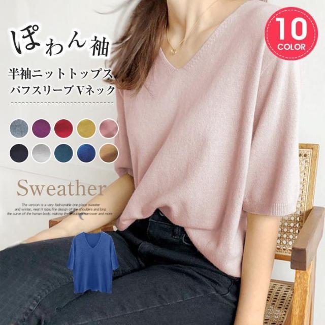 ニット パフスリーブ レディース 半袖 Vネック トップス バルーン袖 コーデ フェミニン シンプル ゆったり 体型カーバー