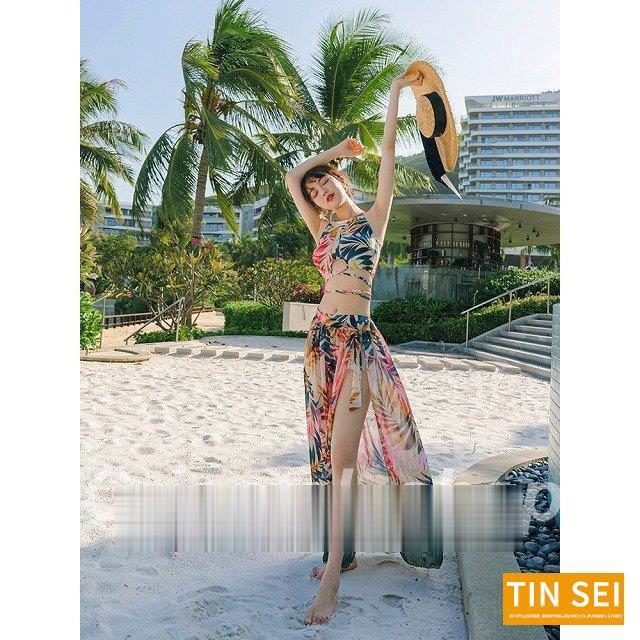パレオ付のカラフルなビキニ3点セットです?