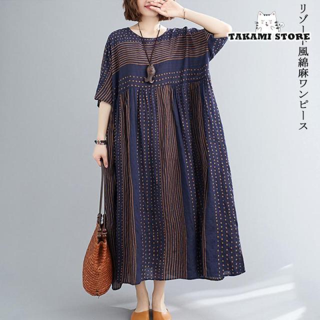 ワンピース ロングワンピース マキシ ロングワンピ リゾート風 40代 体型カバー 着痩せ 大きいサイズ 綿麻 半袖 5分袖 夏 薄手 ゆったり ストライプ柄