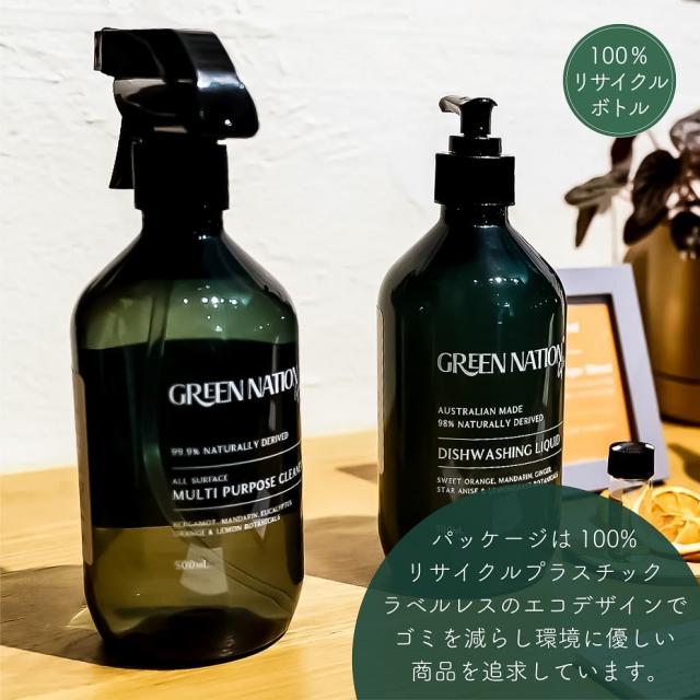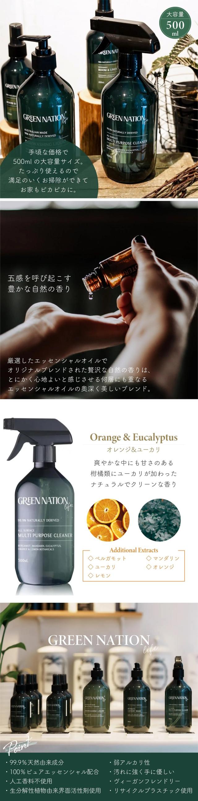 洗剤 クリーナー GREEN NATION life グリーンネイションライフ マルチクリーナー 500ml 大容量 スイートオレンジ&ユーカリの香り 99.9%天然由来成分 万能クリーナー 弱アルカリ性 生分解性 エッセンシャルオイル 精油 人工香料不使用 ラベルレス 掃除用品 キッチン用品