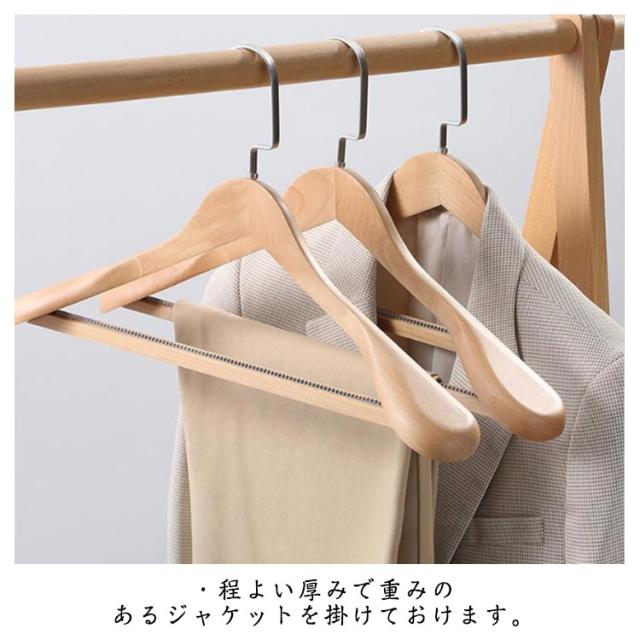 | ・天然素材のやさしいぬくもりが伝わる木製ハンガーです。 ・人間の肩の形に合わせたカーブがスーツをしっかりとキープ。 ・程よい厚みで重みのあるジャケットを掛けておけます。 ・男性用のスーツやジャケット、女性のコートなどをかけるのにぴったりです。 ・バー付きなので、スラックスやマフラーなどを一緒に収納できます。 ・上下の洋服を一緒に掛けておくと着替える時に便利です。 ・エステやサロンなどセンスを大切にする場所にオススメ。 | |