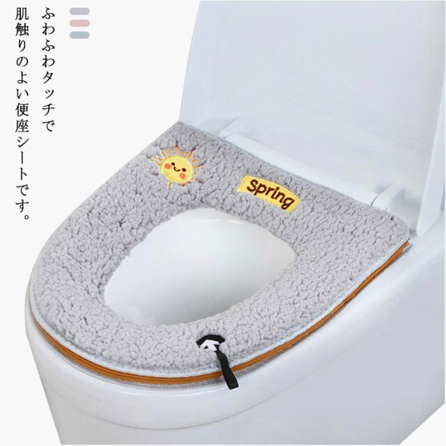 | ふわふわタッチで肌触りのよい便座シートです。 便器カバーを便器の蓋に当てて、ファスナーでしっかりと閉めて、完成します 取っ手付きなので、手を汚さないで便座の蓋を開けることができます ふんわり生地で、暖房便座のヒーターを切ってもお尻が冷たくないので、節電できます 洗浄暖房型、O型、U型、どのタイプの便座にも使用できます 繰り返し洗濯機で丸洗いできます。(ネット使用) | |