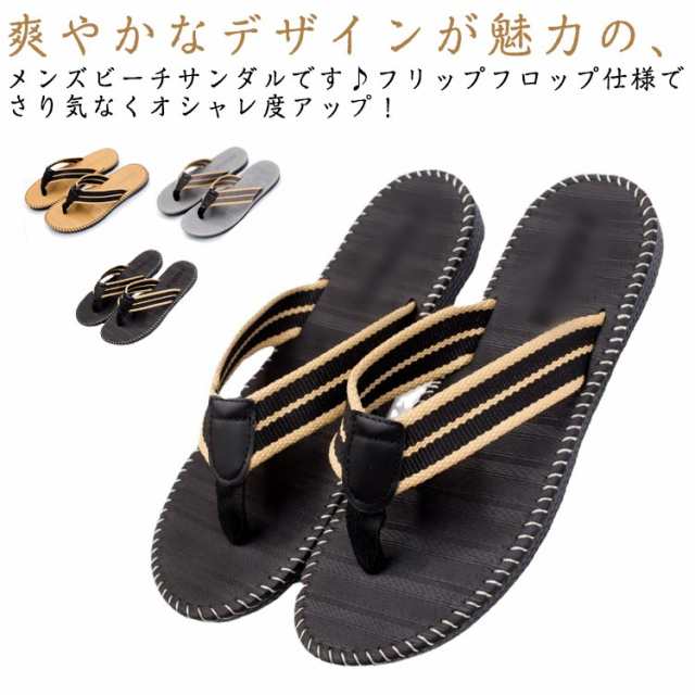 | 爽やかなデザインが魅力の、メンズビーチサンダルです♪フリップフロップ仕様でさり気なくオシャレ度アップ! ショートパンツやデニムと合わせるだけで、夏らしいスタイリングの完成です! 普段使いはもちろん、旅行やリゾートにもおすすめのフラットサンダルです。 色違いでそろえたい夏の必需品。23cm?28.5cmまで豊富なサイズ展開! | |