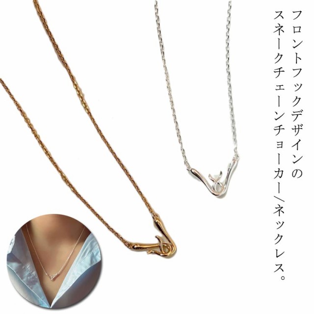 | フロントフックデザインのスネークチェーンチョーカー/ネックレス。フックが異なる2タイプと長さの異なる2タイプをご用意しました。フロントフックは前側で留められるから着脱が簡単。フックを後ろ側にしても着用しても◎ 【モードに決まる洗練デザイン】 シンプルだけどさりげない個性が光るデザインは、洗練されたモードな印象に。どんなコーデにも合わせやすいヘビロテアイテムになること間違いなしです。 【着脱楽ちんなフロントフック】 フロントのフックを引っかけるだけで簡単に着脱ができるので、忙しい朝でも気軽に使えるのが嬉しいポイント◎フックを後ろ側にしても違和感なくご着用いただけます。 | |