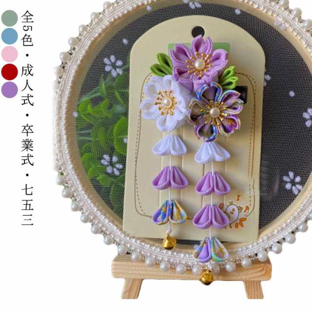 全5色・送料無料! 髪飾り ちりめん ヘッドドレス ウェディング 着物 和装 浴衣 成人式 結婚式 七五三 卒業式 卒園式 花 袴 花盛り 女の子 キッズ 大人 桜 鈴 藤下がり ビラかんざし パッチン留め 三歳 七歳 母の日 ギフト 手作り かわいい