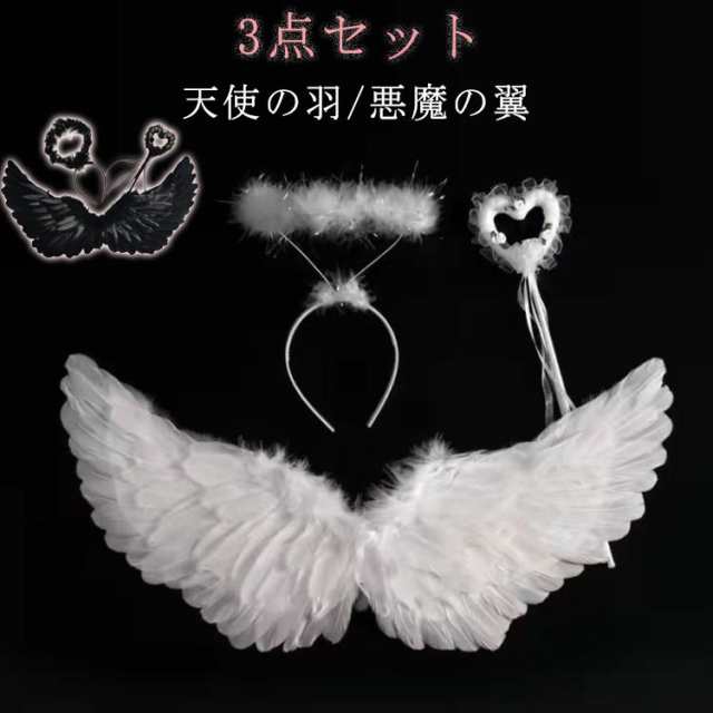 3点セット 天使の羽 カチューシャ ステッキ コスチューム キッズ ベビー 子供用 エンジェル デビル 悪魔 ハロウィン 仮装 コスプレ衣装 かわいい 天使の羽 コスプレ用 羽根 翼 フェザー ウィング イベント パーティー 妖精 変装