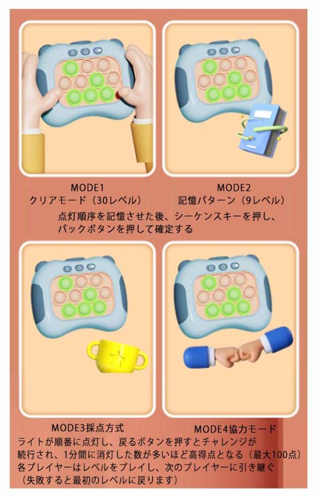 | 電子もぐらたたき プッシュポップ 遊びモード四つがあり、ライド点滅する場所を押すなといろいろな遊び方があり。 ゲーム機の背面カバーを開けて1.5VAAA単4アルカリ電池3本入れなさい。 多動症(ADD)と自閉症(ADHD)の成人と児童にも適用する。 子供の集中力を育成し、反応力を訓練し、また気を失ったり、指をかじったりするなどの悪い習慣の育成を根絶することができる。 | |
