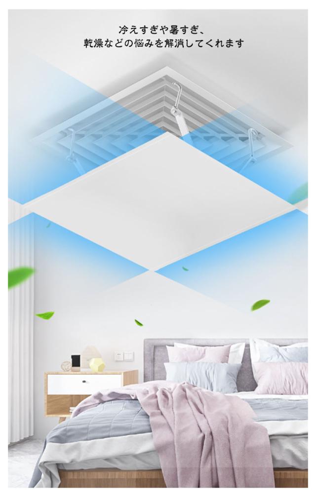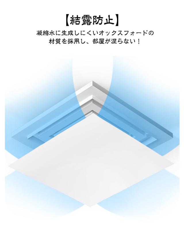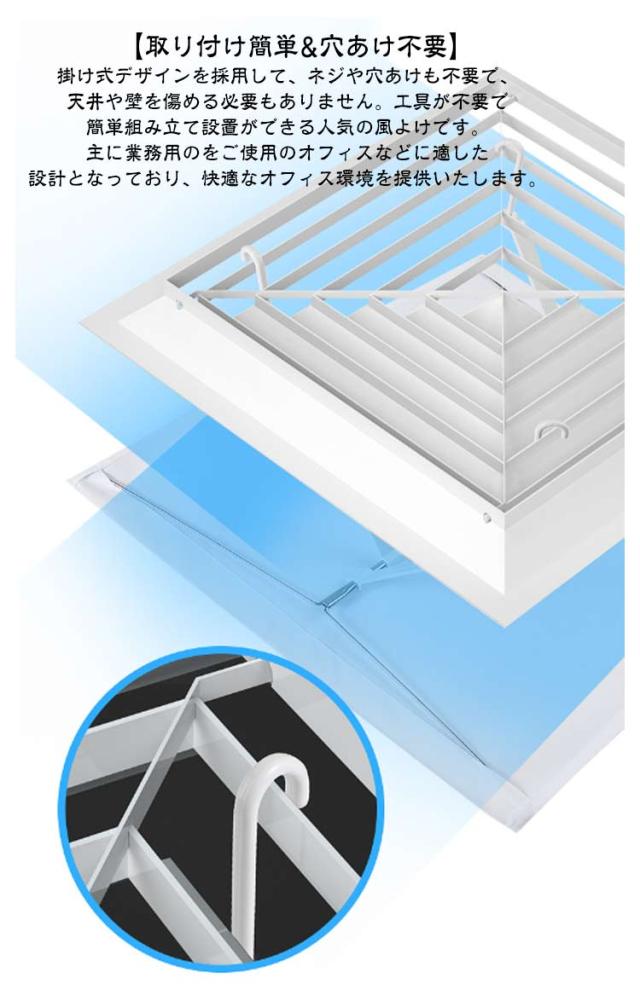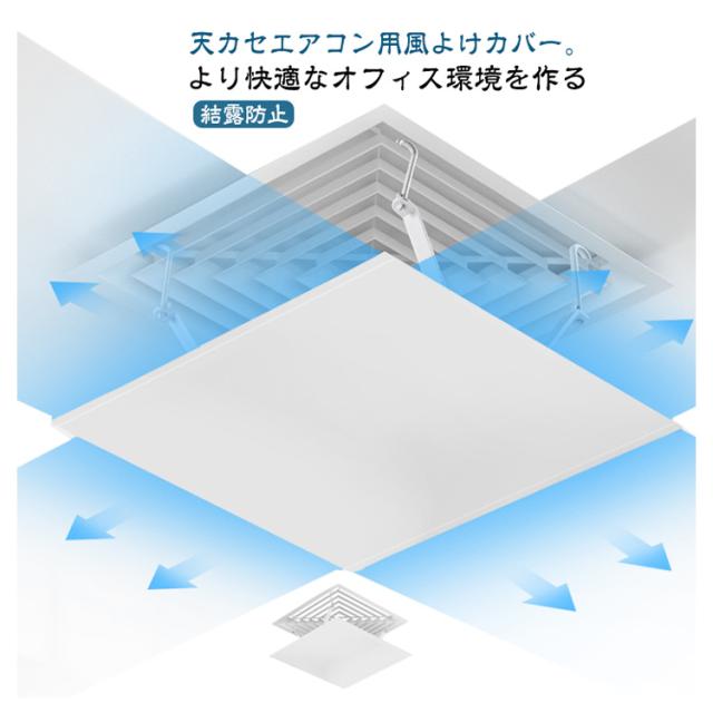 | 天カセエアコン用風よけカバー。 【より快適なオフィス環境を作る】オフィスの冷房が効きすぎていることが多く、特に頭上からの直風に当たると、風邪、頭痛、冷房病になる。この風向調整板を利用してエアコンの吹き出し口をカバーして、頭の上からの直撃風をよけることができますし、冷風を周りに拡散してオフィスの温度ムラを軽減することもできます。より快適なオフィス環境を造ります! 【取り付け簡単&穴あけ不要】掛け式デザインを採用して、ネジや穴あけも不要で、天井や壁を傷める必要もありません。工具が不要で簡単組み立て設置ができる人気の風よけです。主に業務用のをご使用のオフィスなどに適した設計となっており、快適なオフィス環境を提供いたします。 【結露防止】凝縮水に生成しにくいオックスフォードの材質を採用し、部屋が湿らない! 冷えすぎや暑すぎ、乾燥などの悩みを解消してくれます リビング、ホテル、オフィス、学校、その他の天カセエアコンを備えた場所に適用します。 | |
