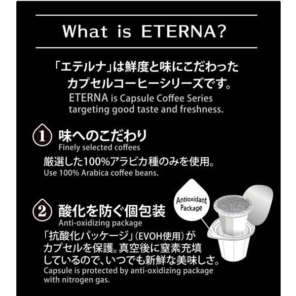 | ETERNA(エテルナ)は、厳選した100%アラビカ種のみを使用した一杯用ネスプレッソ互換カプセルコーヒーです。コーヒーが持つ本来の風味とエスプレッソでしか味わえないコクをそのまま生かしながら、日本で愛飲されているドリップコーヒーのようなマイルド且つ透明感溢れる味わいを実現しました。 |