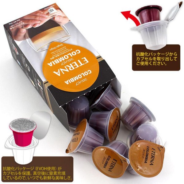 | ETERNA(エテルナ)は、厳選した100%アラビカ種のみを使用した一杯用ネスプレッソ互換カプセルコーヒーです。コーヒーが持つ本来の風味とエスプレッソでしか味わえないコクをそのまま生かしながら、日本で愛飲されているドリップコーヒーのようなマイルド且つ透明感溢れる味わいを実現しました。 |