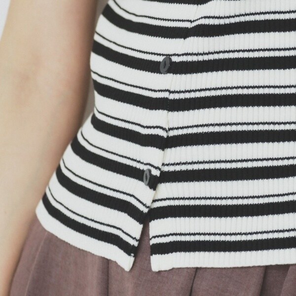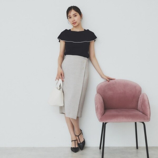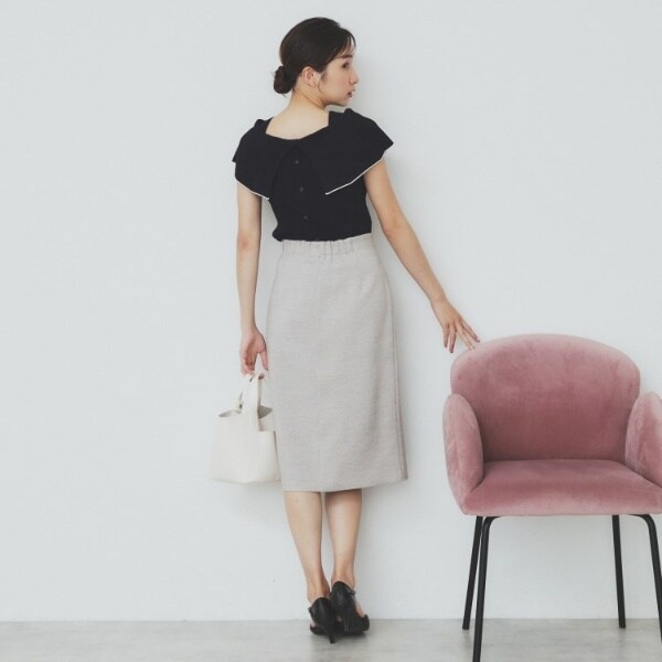 ・裾部分はさりげなくフィット感を持たせており、パンツやスカートの上に合わせた時も、きれいに収まり、スタイルアップ効果が期待できます。