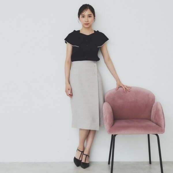 ・ボタンディテールが施されており、正面から見てもバックスタイルにしても、さり気ないアクセントをプラス。