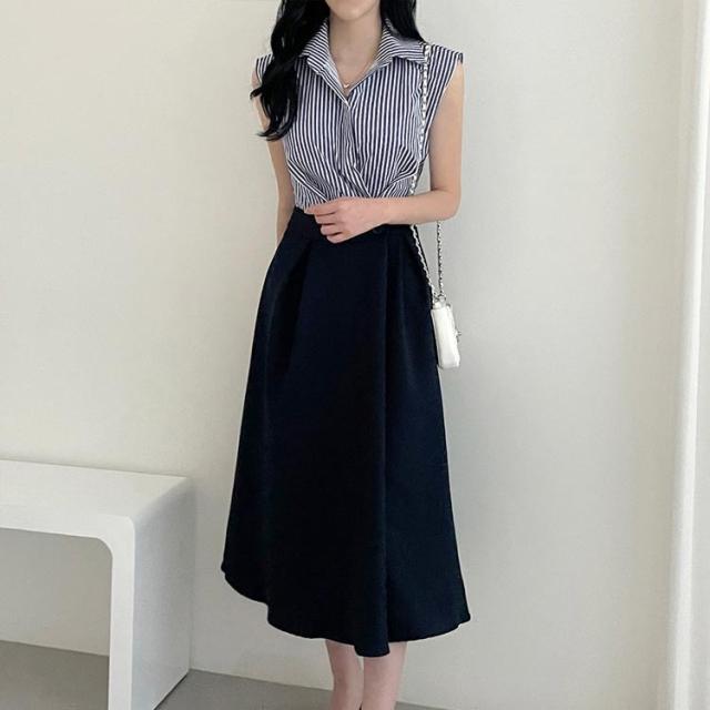 シャツワンピース 夏 ノースリーブ 冬 春 秋 ストライプ ロング ロングワンピース ワンピース Aライン 長袖 きれいめ レディース フレア ツーピース風 半袖 シック ロング丈