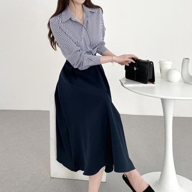 ストライプ柄シャツにスカートを合わせたようなセパレート風デザインのワンピース。