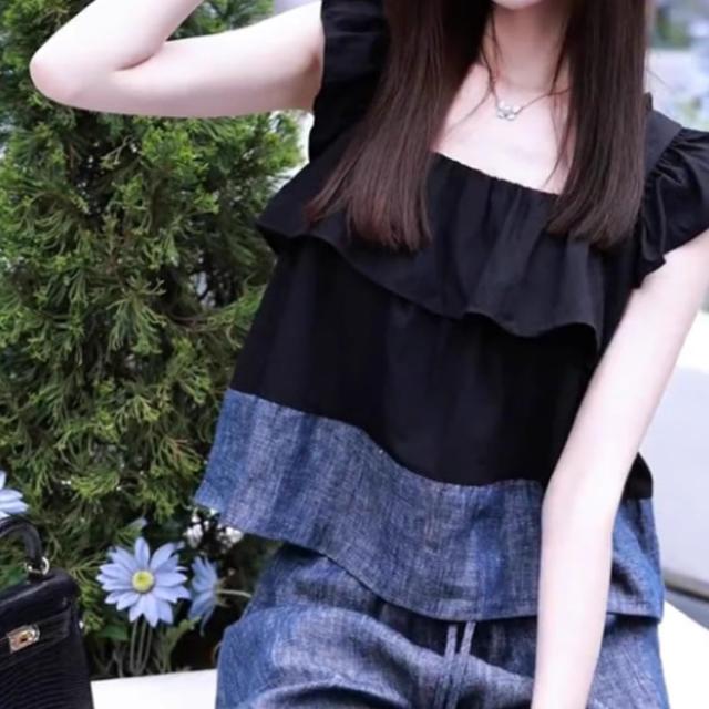 キャミソール カジュアル レディース パンツ トップス スクエアネック スーツ タンクトップ デニム 春 夏 フリル セットアップ バイカラー ロングパンツ エレガント きれいめ ノース ワイドパンツ