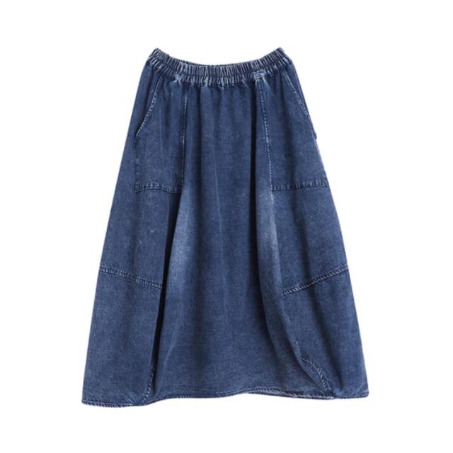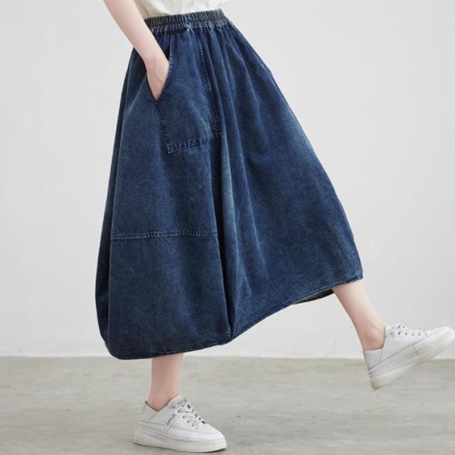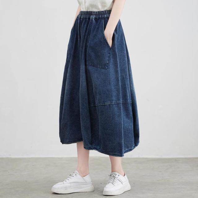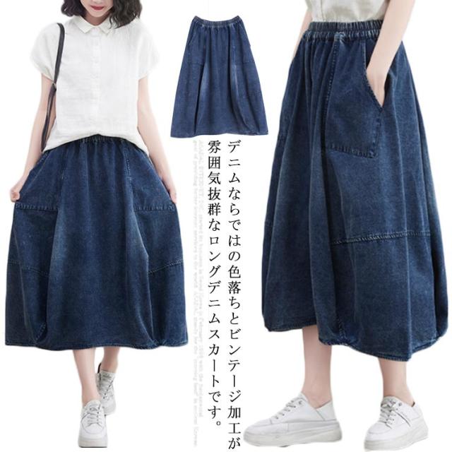 ロングデニムスカート スカート ミモレ丈 デニムスカート Aラインスカート バルーンスカート ウエストゴム 体型カバー おしゃれ 可愛い カジュアルスカート