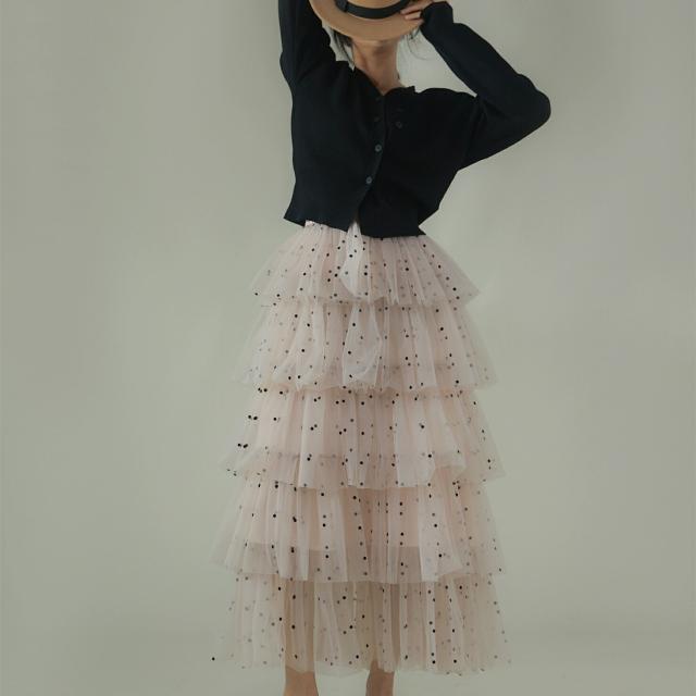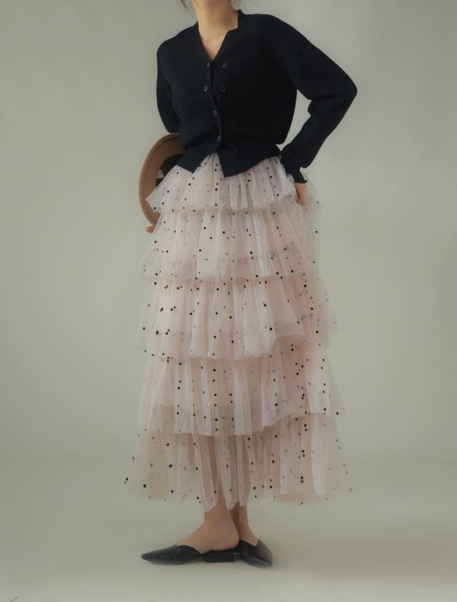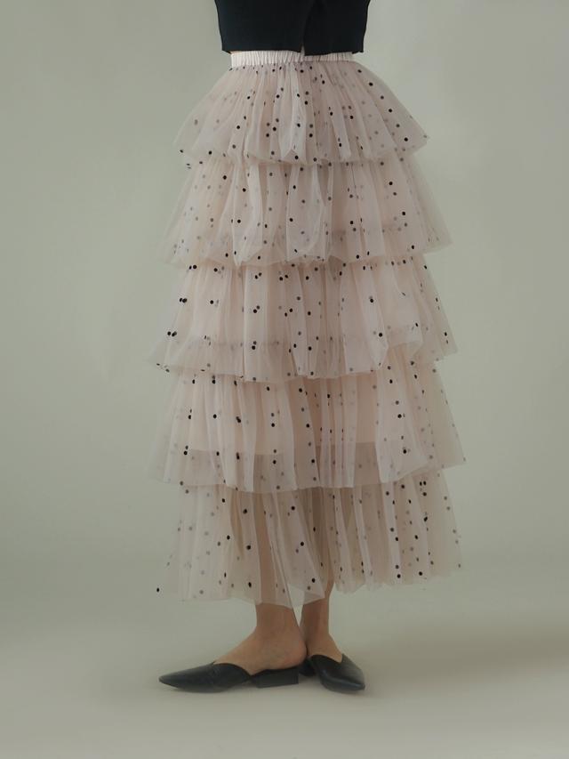 トレンドのチュールフリルロングスカート。