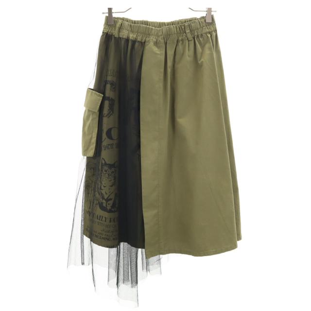 スカラー ネコ柄 ミモレ丈 チュール重ねアシンメトリー スカート M カーキ ScoLar レディース