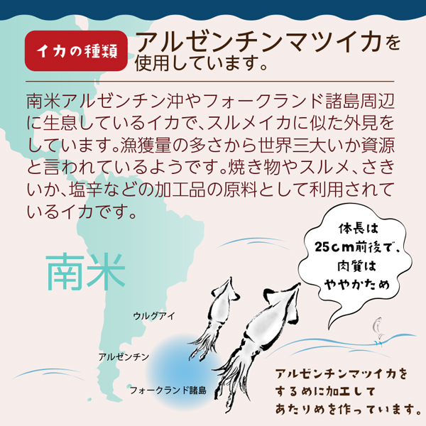 原材料名 :するめ(国内製造又は中国製造)、(一部にいかを含む)