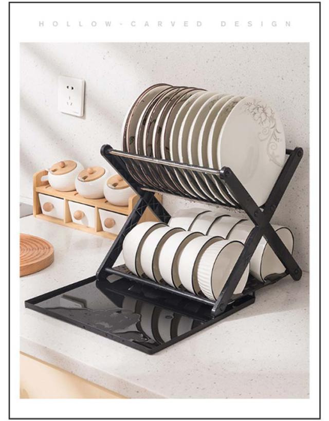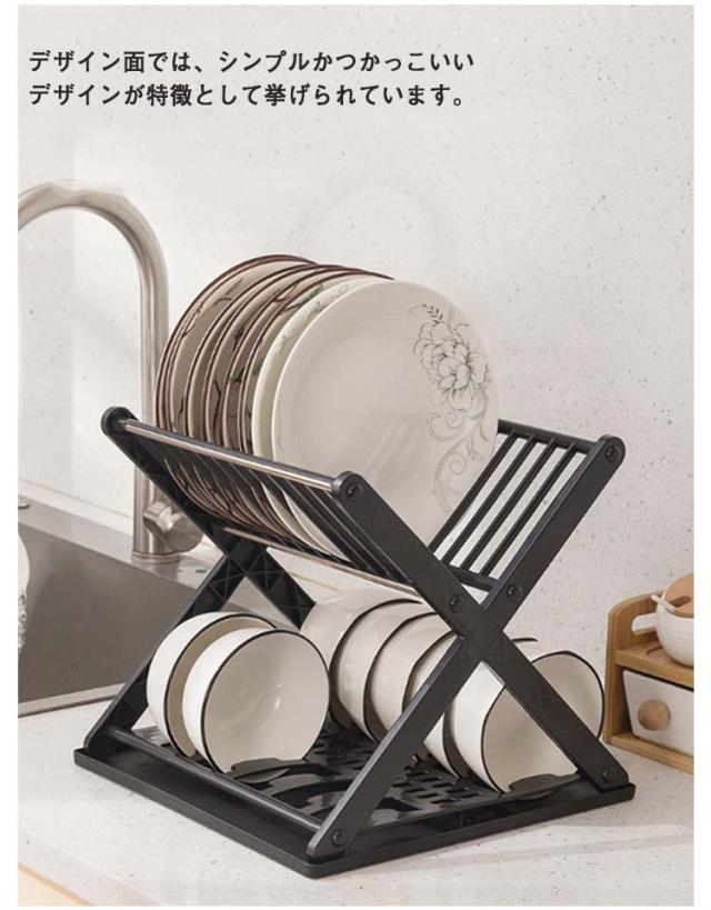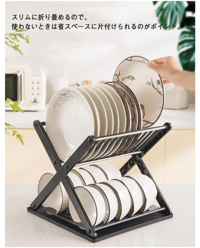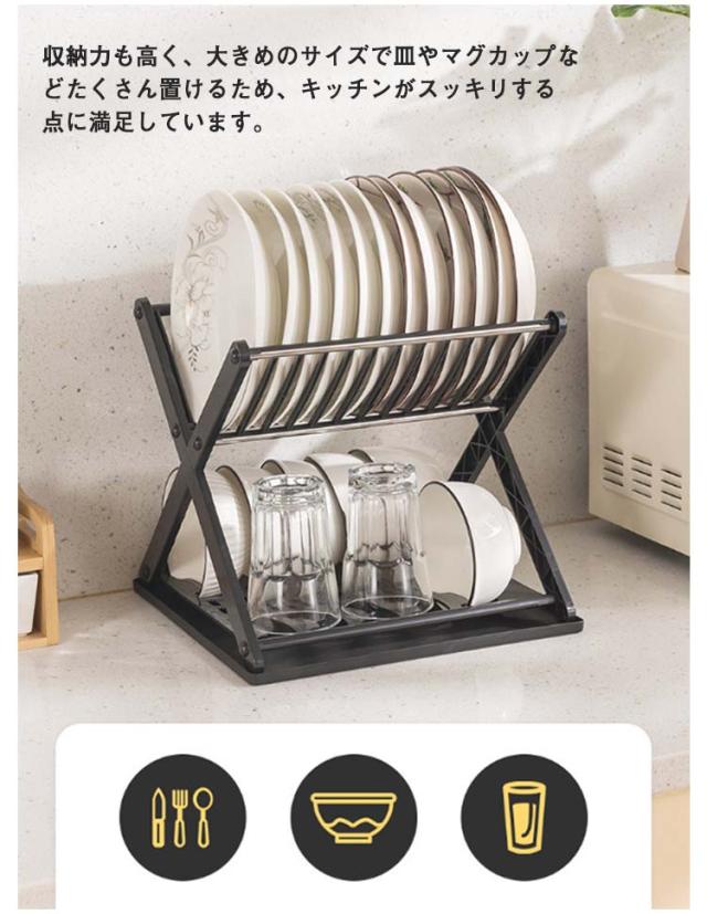| 上段はお皿、下段はお椀やカップ等を分けて水切りできます。X型水切りラック【トレー付き】 スリムに折り畳めるので、使わないときは省スペースに片付けられるのがポイント。 サビに強いステンレス製洗い物ラックは、耐久性が抜群で、食器などの水切りを衛生的・安心的にさせます。 デザイン面では、シンプルかつかっこいいデザインが特徴として挙げられています。 収納力も高く、大きめのサイズで皿やマグカップなどたくさん置けるため、キッチンがスッキリする点に満足しています。 | |