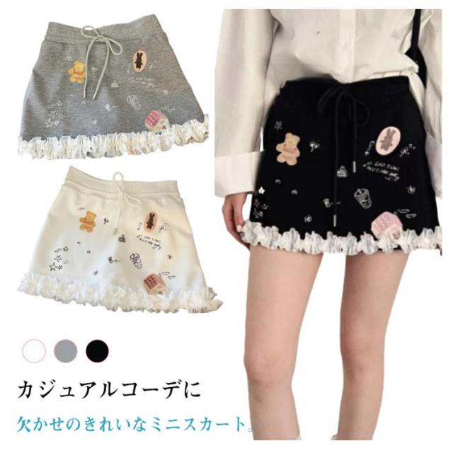 スウェット ミニスカート レディース スウェットスカート レース フリル裾 プリント 可愛い インナーパンツ付き スカート 台形スカート ストレッチ 着?せ 快適 カジュアル きれいめ おしゃれ ガーリー 送料無料