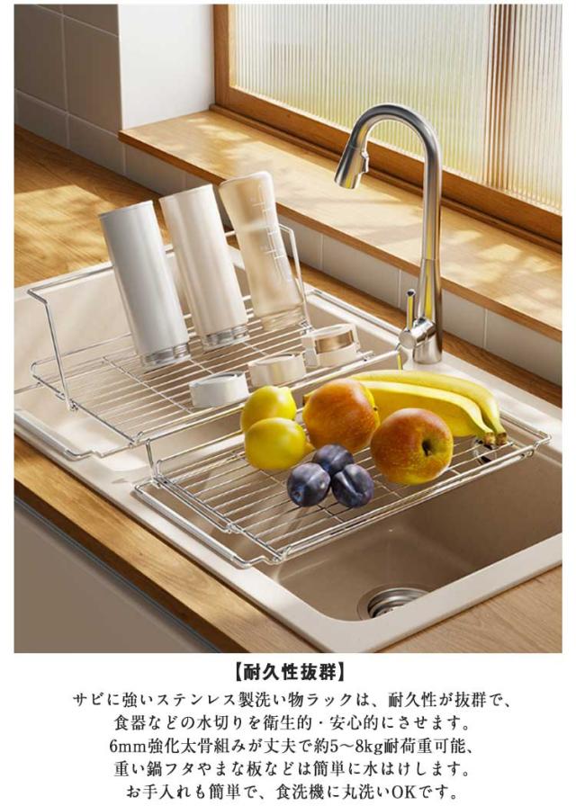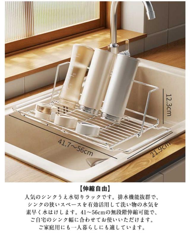 | お皿、水筒も立てかけられる伸縮式水切りラック。 【伸縮自由】人気のシンクうえ水切りラックです。排水機能抜群で、シンクの狭いスペースを有効活用して洗い物の水気を素早く水はけします。41〜56cmの無段階伸縮可能で、ご自宅のシンク幅に合わせてお使いいただけます。ご家庭用にも一人暮らしにも適しています。 【水筒の水切りを安定に】105°傾斜の背もたれ付きで、水筒・コップ・哺乳瓶などの筒型容器を安定して立てかけられて、滑り落ち防止できる水切りかごです。3cmのガードレールが備えてお食器をしっかりガードです。背もたれが省スペースの折りたたみ設計で、使用後は折りたたんでコンパクトに収納できます。 【耐久性抜群】サビに強いステンレス製洗い物ラックは、耐久性が抜群で、食器などの水切りを衛生的・安心的にさせます。6mm強化太骨組みが丈夫で約5〜8kg耐荷重可能、重い鍋フタやまな板などは簡単に水はけします。お手入れも簡単で、食洗機に丸洗いOKです。 【取り付けが簡単】多層構造の水切りラックに比べ、複雑な工具を必要とせず、広げてシンクに置くだけで使用できます。コンパクトなサイズなので収納が簡単、スペースを節約でき、使用しないときは脇に置いておくだけです。 【多機能】食器干しラックだけでない多機能ラック!調理中の鍋フタの仮置き場としても大活躍。キッチン作業がスムーズに行える便利アイテムです。 | |
