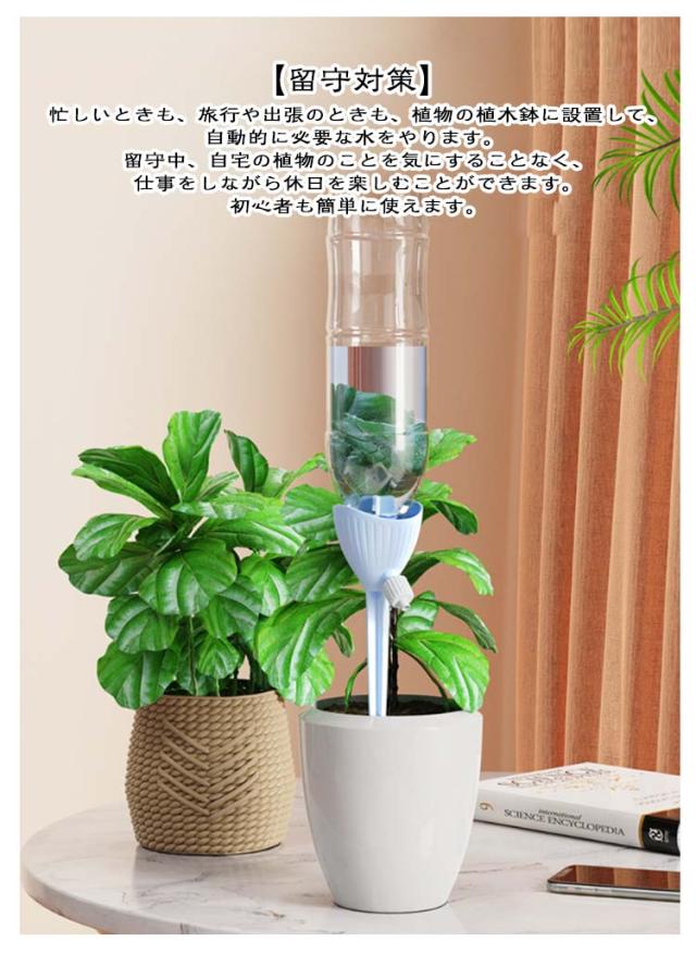 | 【適用範囲】ガーデニング 植物、留守、盆栽、野菜など適用。給水キャップは使用簡単で繰り返し使用可能で、家で植物を植えるのがより簡単で便利になります。湿気を好む植物や大きな鉢植えの植物には、複数の自動給水器で設置することができます。 【留守対策】忙しいときも、旅行や出張のときも、植物の植木鉢に設置して、自動的に必要な水をやります。 留守中、自宅の植物のことを気にすることなく、仕事をしながら休日を楽しむことができます。初心者も簡単に使えます。 【盆栽自動給水キャップ】点滴式、自動植物給水器は、水やりと同時に栄養も補給できて、植物の枯れを防 ぐだけでなく、植物の健康も守ります。手軽に自動給水器を設置して、自動的に植物に水分を補給できます。ご心配なく便利で日常生活の給水ツールです。 【水分量調節】自動水やり器に調節機能付き、土の乾き具合にあわせて給水量の増減、流速を調節し土を適度な湿り具合に保ってくれます。調整弁を時計回りに回すと、給水スピードが遅くになり、逆時計回りに回すと、給水スピードが速くになります。 【ペットボトル対応】直径28-30mmのペットボトルが使用可能です。使用簡単、キャップを外し、適量の水を入れ、給水キャップを直接水筒にねじ込みます。 最後に、先端を鉢の土に差し込み、調整弁で給水量を調整すれば、自動的に植物に給水されます。 | |