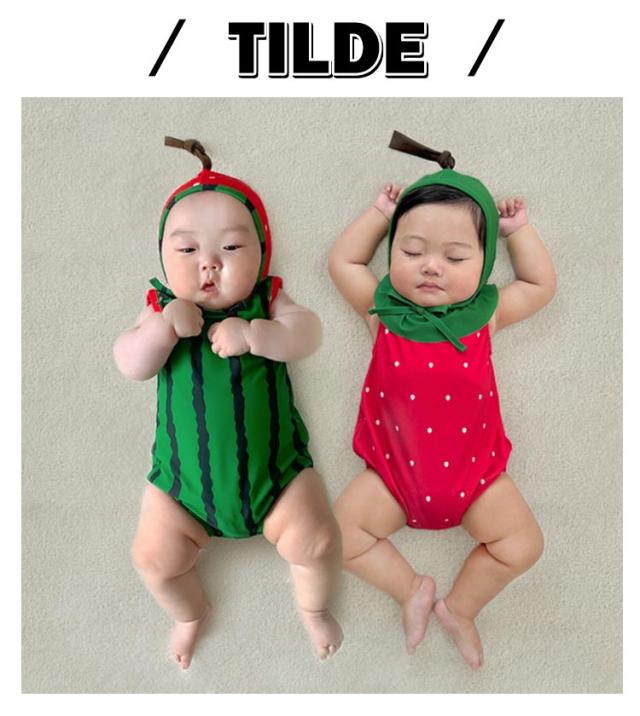 | 【幼児用水着】 【帽子付き】 暑い夏をエンジョイ! キャップとセットになった可愛いフルーツ水着です。 | |