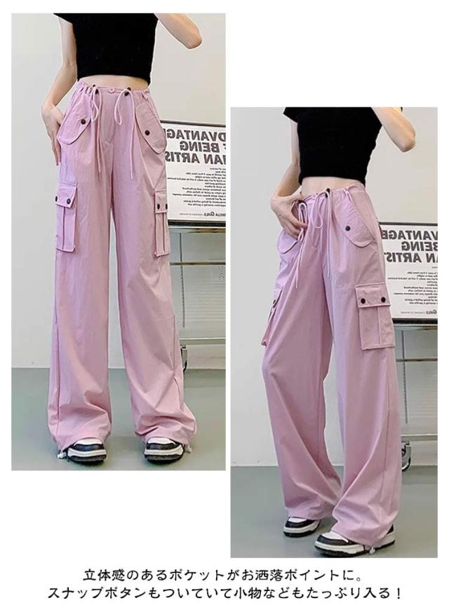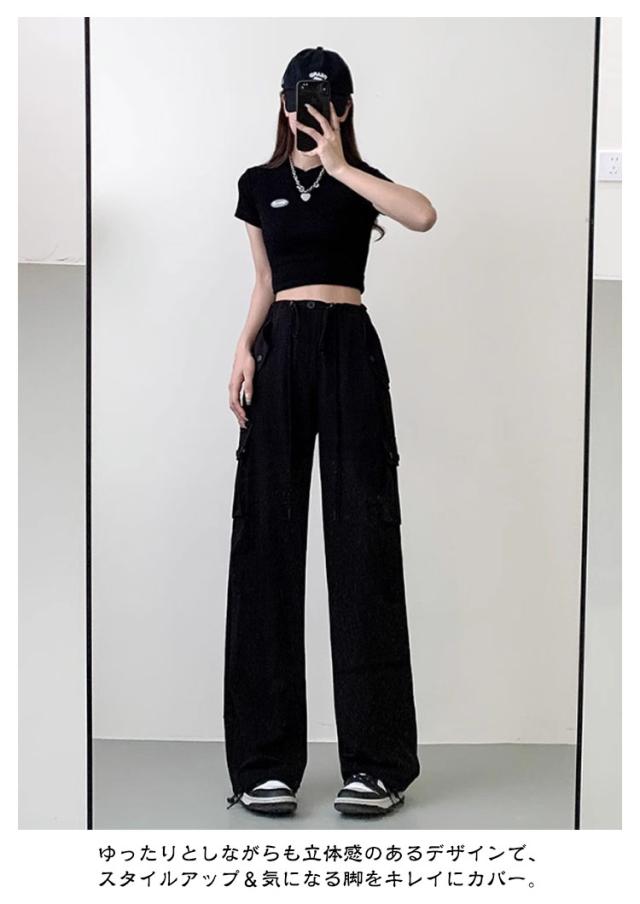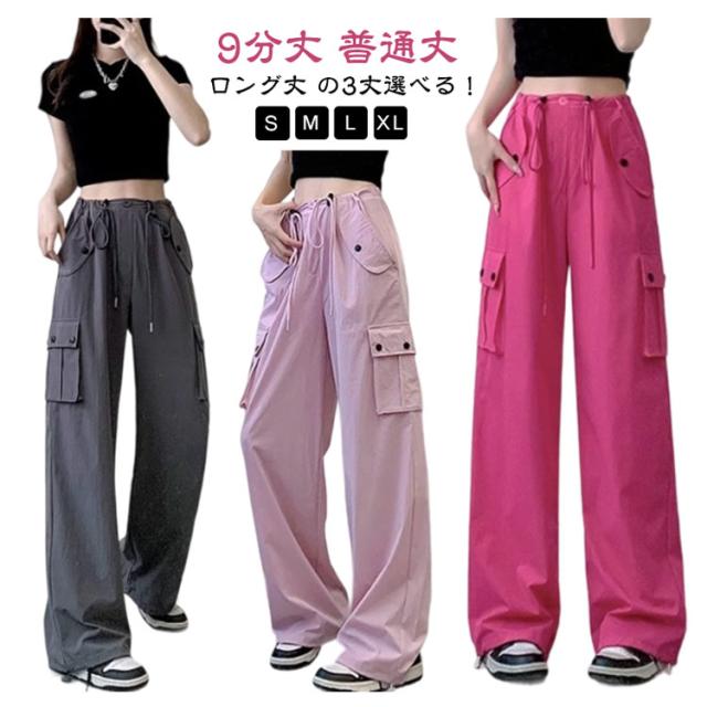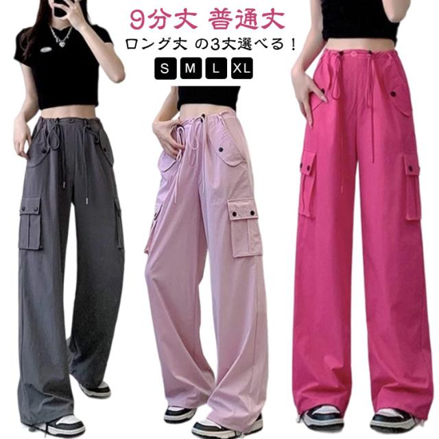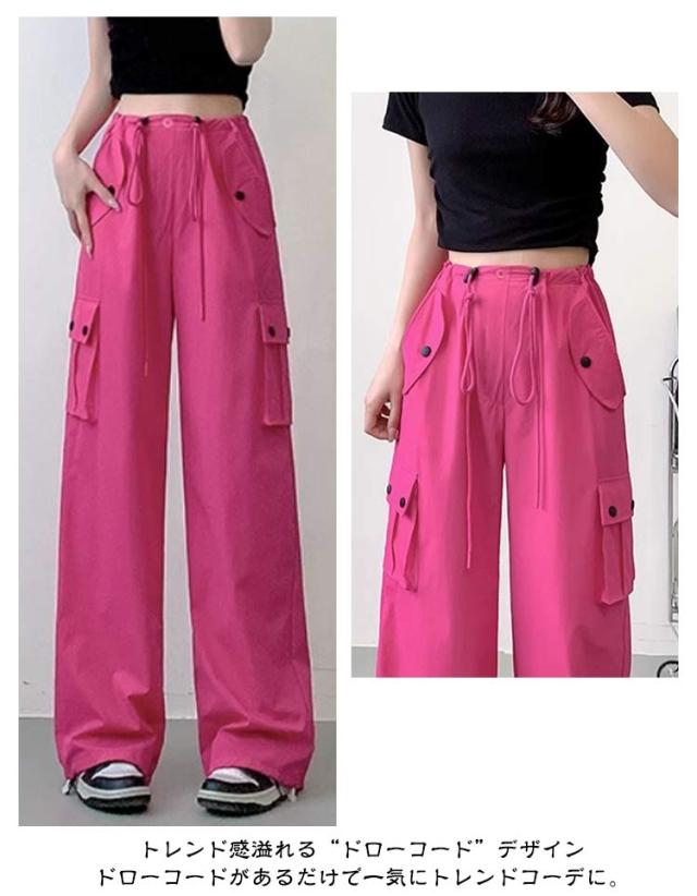 ロングパンツ 長ズボン ハイウエスト カーゴパンツ 低身長 高身長 ヒップホップ ドローコード カーゴパンツ サイドポケット レディース 体型カバー 美脚 ワイドパンツ 作業着 かっこいい 無地 ルーズ おしゃれ かわいい 動きやすい スポーツ