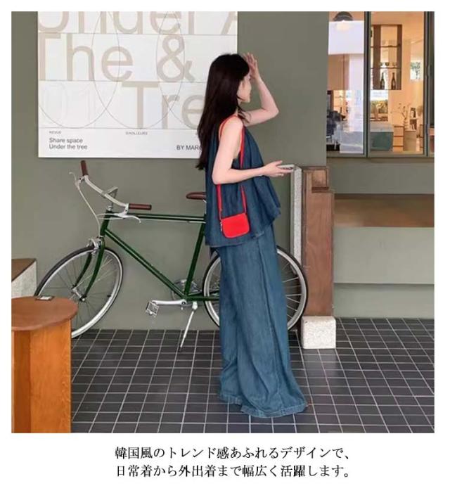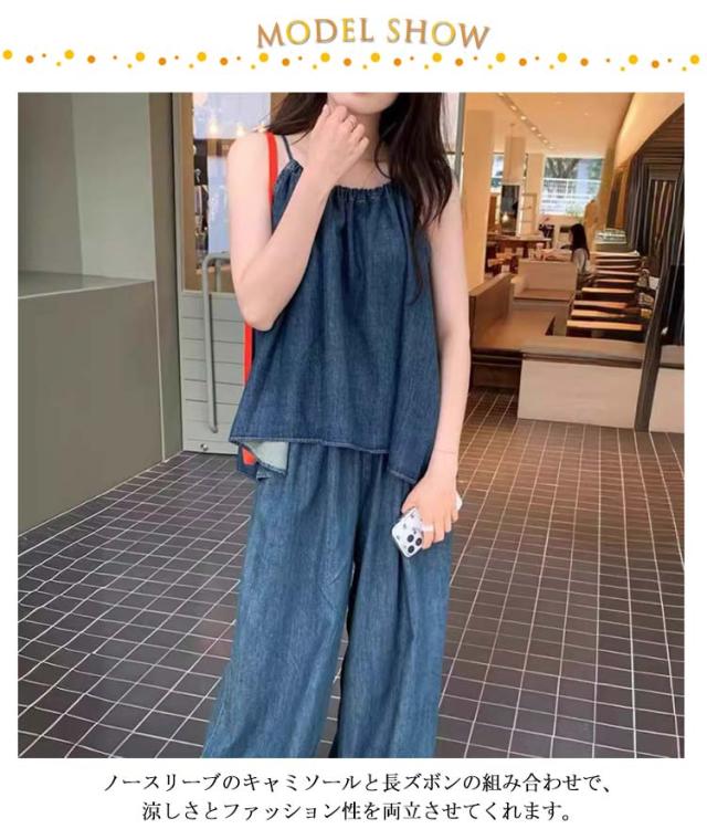 パンツセットアップ レディース パンツセットアップ ゆったり キャミソール デニム風 上下セット ングパンツ ノースリーブ 長ズボン タンクトップ 大きいサイズ ギャザー リゾート 旅行 韓国風