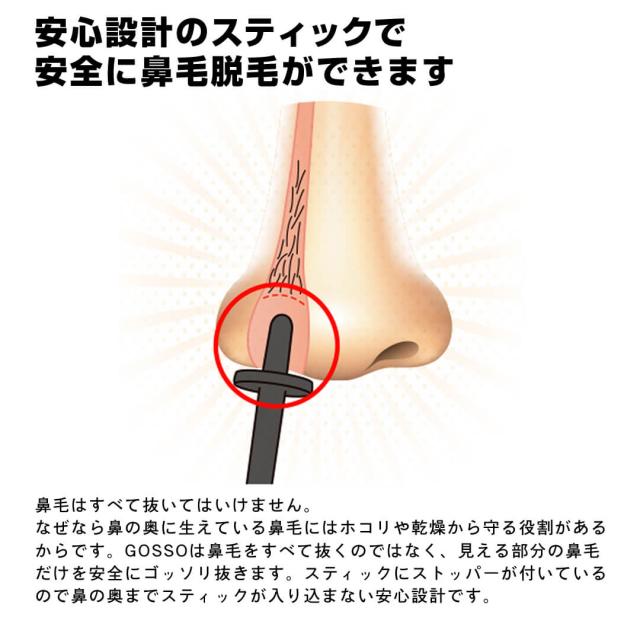 Q:血が出た場合 A:毛の根元は皮膚の中で毛細血管と繋がっており、脱毛により稀に出血する場合がございます。万が一出血がした場合は、軽くティッシュで押さえて頂き、様子を見て下さい。また、鼻の中に瘡蓋がある場合は、ワックスにより瘡蓋をはがす恐れがあるのでご使用はお止めください。出血直後のGOSSOのご使用はお控え下さい。 |