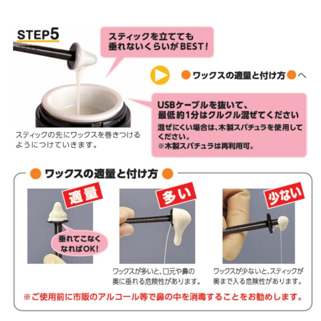 Q:ワックスが鼻に残った時 A:ワックスが鼻の中に残った場合、再度スティックにワックスを付けお試し下さい。残ったワックスも一緒にとる事ができます。また、皮膚に付着した場合は、市販のベビーオイルを綿棒に含ませ、軽く擦りながらお剥がし下さい。 |