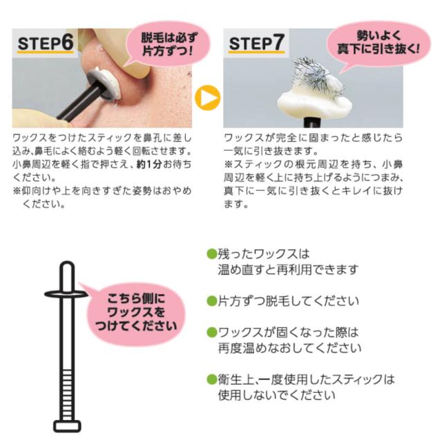 Q:痛くないやり方・コツ A:鼻頭を摘みながらすスティックをしっかり握り、勢い良く真下に引き抜いて下さい。抜いた直後、鼻頭をギュっと摘んで下さい。痛みが緩和されます。ゆっくり抜かれますと、激しい痛みや、ワックスが残ってしまう原因になります。また、脱毛後は乾燥しやすい為、十分な保湿を心がけて下さい。 |