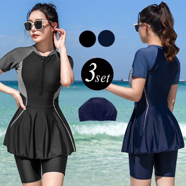 フィットネス水着 レディース 体型カバー 3点セット ワンピース パンツ セパレート 半袖 スイムキャップ めくれ防止 黒 夏 海 プール