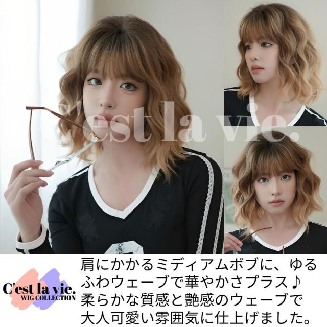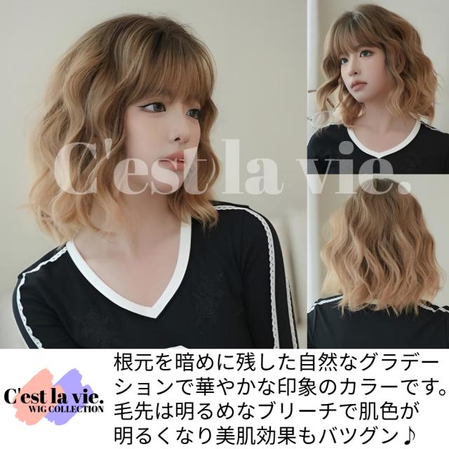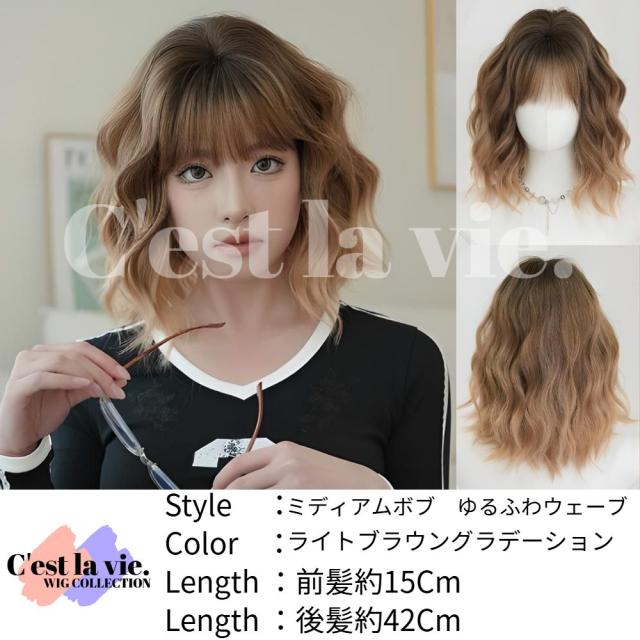 ウィッグ ミディアム ボブ ウェーブ グラデーション ブラウン フルウィッグ 前髪あり 医療用 かつら ネット付き 自然 バレない 普段使い 即日出荷 送料無料