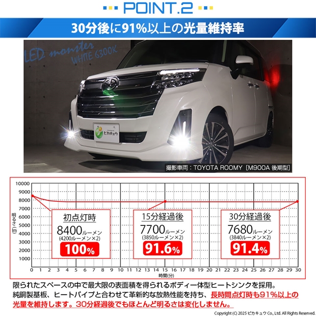 明るさ全光束8400ルーメンの最強のモンスターフォグランプLEDバルブです。放熱性能が高いため、長時間点灯後も91%以上の光量を維持します。30分経過後もほとんど明るさが変化しない放熱対策を施しています。純正球の配光特性に徹底的にこだわり、理想的な配光を実現しています。