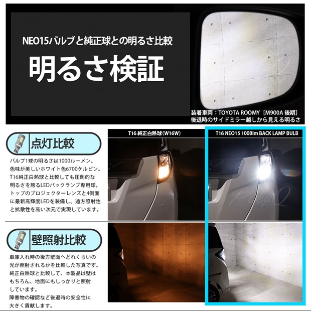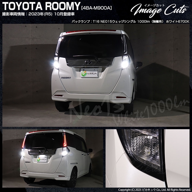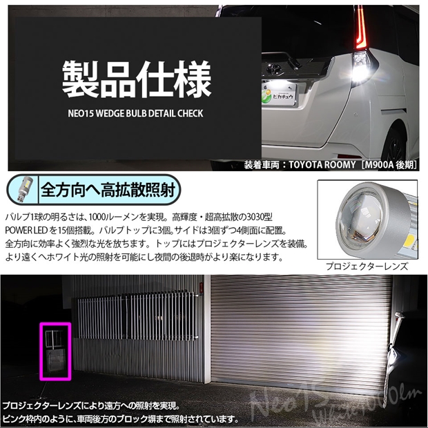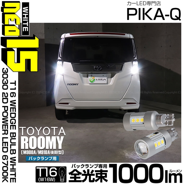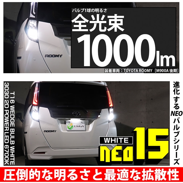 ピカキュウ,LED専門店,LEDバルブ,国産DC12V車,ハイブリッド車対応LEDバルブ,T16シングル,W16W,バックランプ,ホワイト,全光束1000lm,NEO15,トヨタ,TOYOTA,ルーミー,ROOMY,M900A,M910A