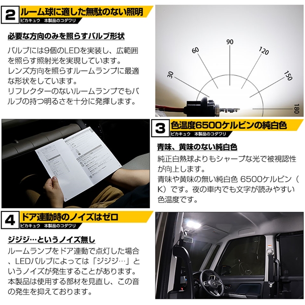 ルームランプをドア連動にして点灯した場合、LEDバルブによってはノイズが出る場合があります。当製品は使用する部材を見直しノイズの発生を抑えました。