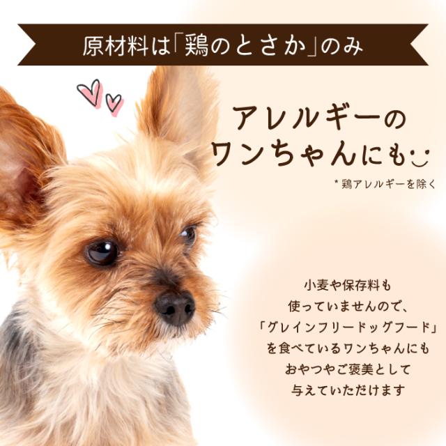 無添加、無着色で低温乾燥(30℃)でじっくり3日間乾燥し、旨味・風味を閉じ込めました。 人間用のヒアルロン酸サプリメントの原材料にも使われる「鶏とさか」。 ワンちゃんの関節ケアや、室内でのストレス発散におすすめです。 しっかり乾燥させたジャーキーなので、噛み噛みタイムを長くとることができます。 「ワンちゃんたちがより食べやすいように細いとさかがほしい!」 そんな飼い主さまの声から誕生しました! 自然素材のため色形状にバラツキがあります。 開封後は冷暗所に保管しお早めに与えてください。 与えすぎない様に注意してください。丸飲みの恐れがあります。 与えている時は飼い主さまの見ている所で与えてください。 |