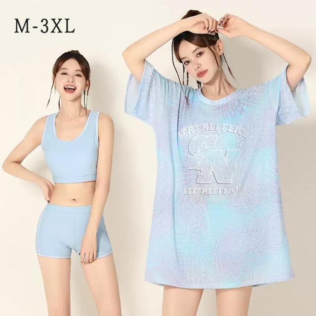 3点セット 水着 レディース 体型カバー タンキニ 大きいサイズ ラッシュガード 長袖 セパレート 露出控えめ インナーパンツ ボーイレッグ ワイヤーなし パッド付 海 プール リゾート おしゃれ ぽっちゃり 韓国風 中学生 高校生 大学生 大人 ブルー 水陸両用 M-3XL ブルー