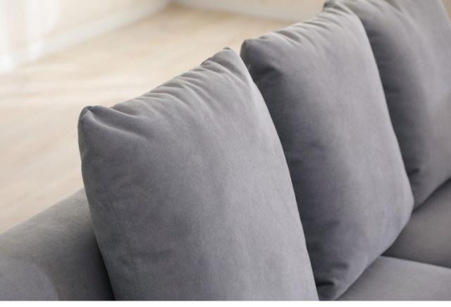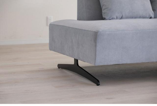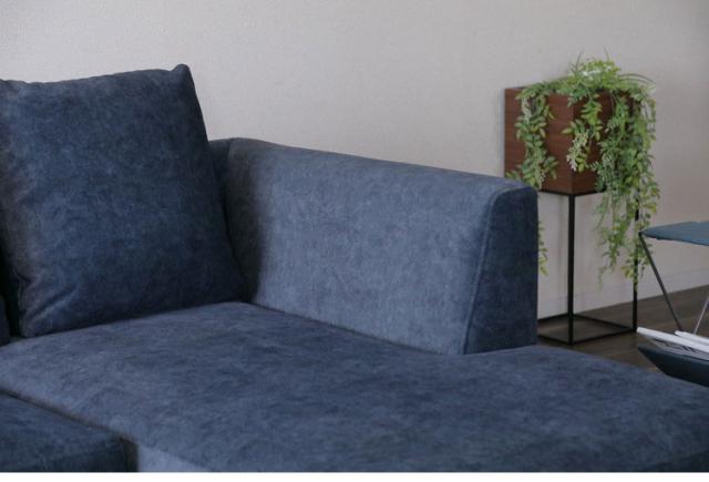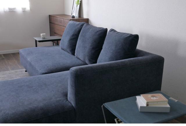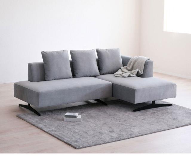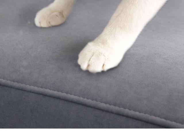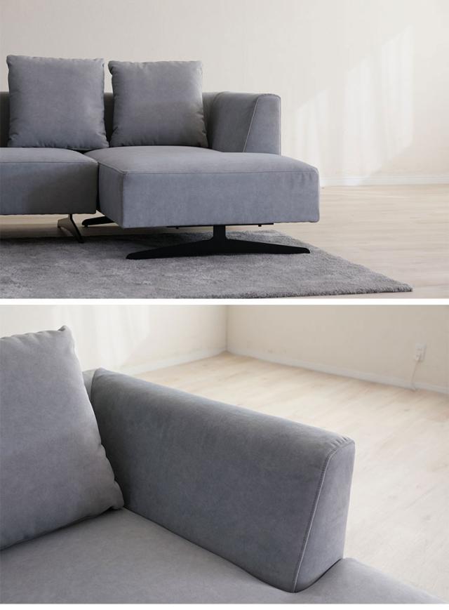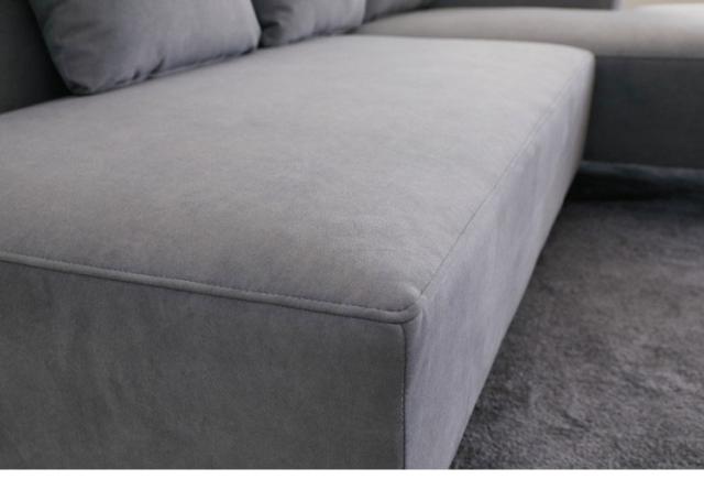 ファブリック張り込みカウチソファです。背面は柔らかめで少し沈み、座面は堅すぎず柔らかすぎず一般的な座り心地です。張地は耐久性に優れており、引っ掻きに強く、爪が入りにくいためペットを飼われている方におすすめです。